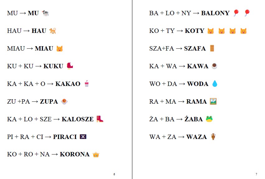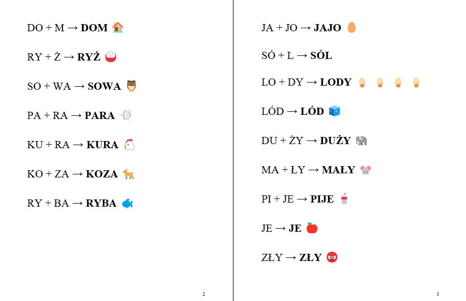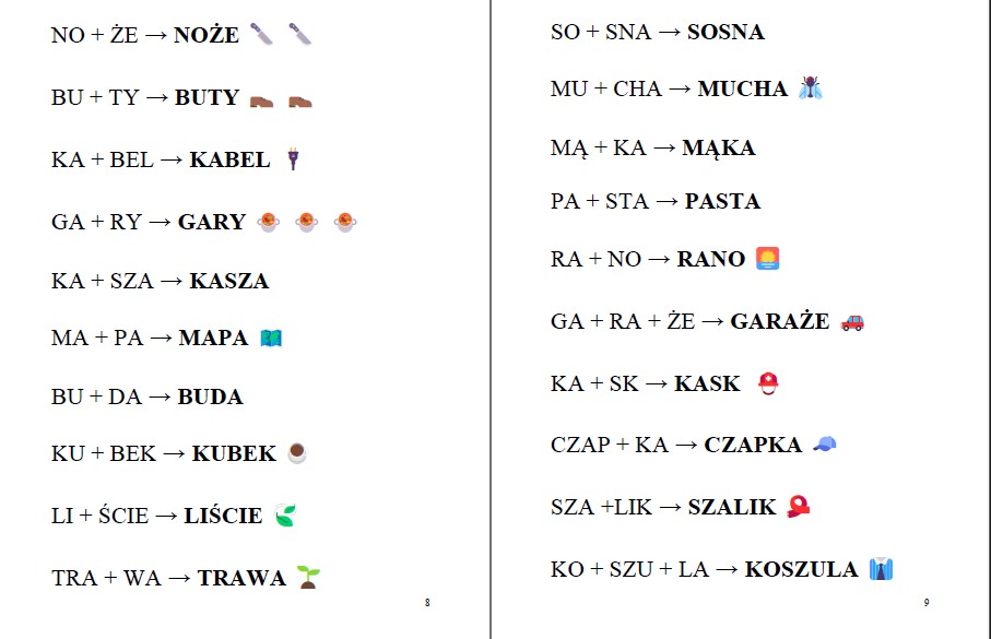 Materiał do czytania sylabami, 24 strony słów z ikonkami