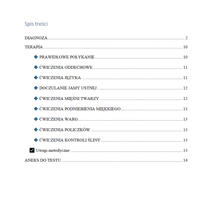 Po prostu – w narzędziu badawczym zawarte są także informacje o możliwych przyczynach danej dysfunkcji. Natomiast rozdział poświęcony terapii to wypisane konkretne ćwiczenia i kroki które trzeba podjąć w terapii. Możesz całościowo korzystać z zawartych w ebooku treści i dokładać swoje ulubione ćwiczenia.